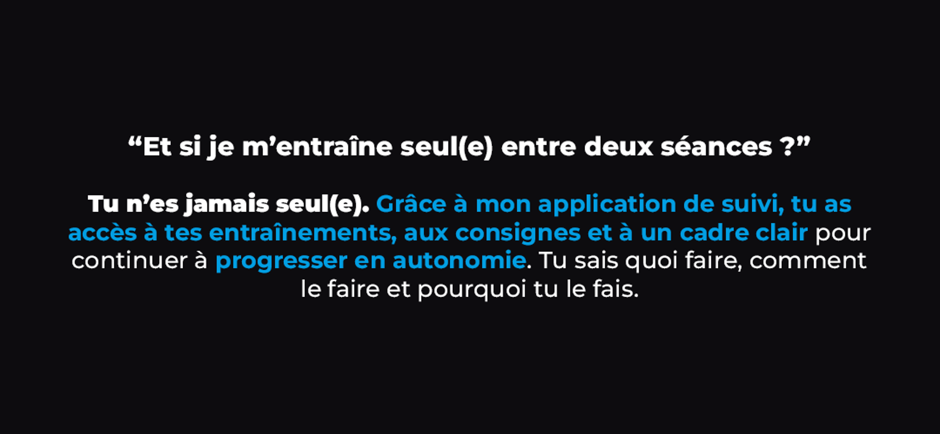 Et lorsque tu t’entraînes en autonomie, tu n’es jamais seul(e) non plus. Grâce à mon application de suivi, tu as accès à tes entraînements, aux consignes, et à un cadre clair pour continuer à avancer entre les séances.